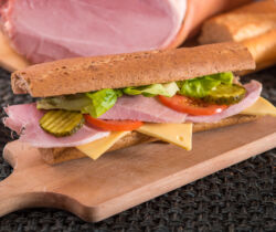 Tous les produits présentés peuvent garnir des miches ou pistolets, des sandwiches au lait moelleux ou des morceaux de baguettes croquantes, ce qui fait de notre maison la sandwicherie qui offre le plus grand choix de la région; une gamme de salade de poissons ou de viande, d’américain préparé maison complète ce choix.