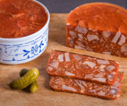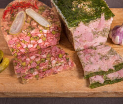 Une gamme complète de produits en gelée tels que: tête pressée nature ou aux cornichons, vinaigrette ardennaise, jambon persillé de Bourgogne, tête de veau, aspic de volaille, aspic de légumes.