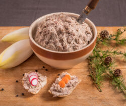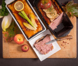 Pâtés de campagne, crème, au poivre, aux chicons, aux airelles, aux pommes Calvados, aux asperges, provençal, mousse de canard au sauternes ainsi que différents pâtés de saison.